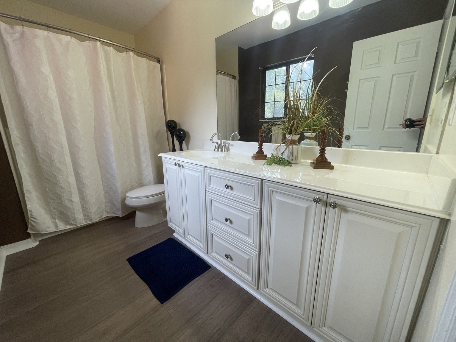 The master bathroom features a tub/tiled shower combination, while the second master bathroom boasts a similar feature alongside an extra-large vanity.