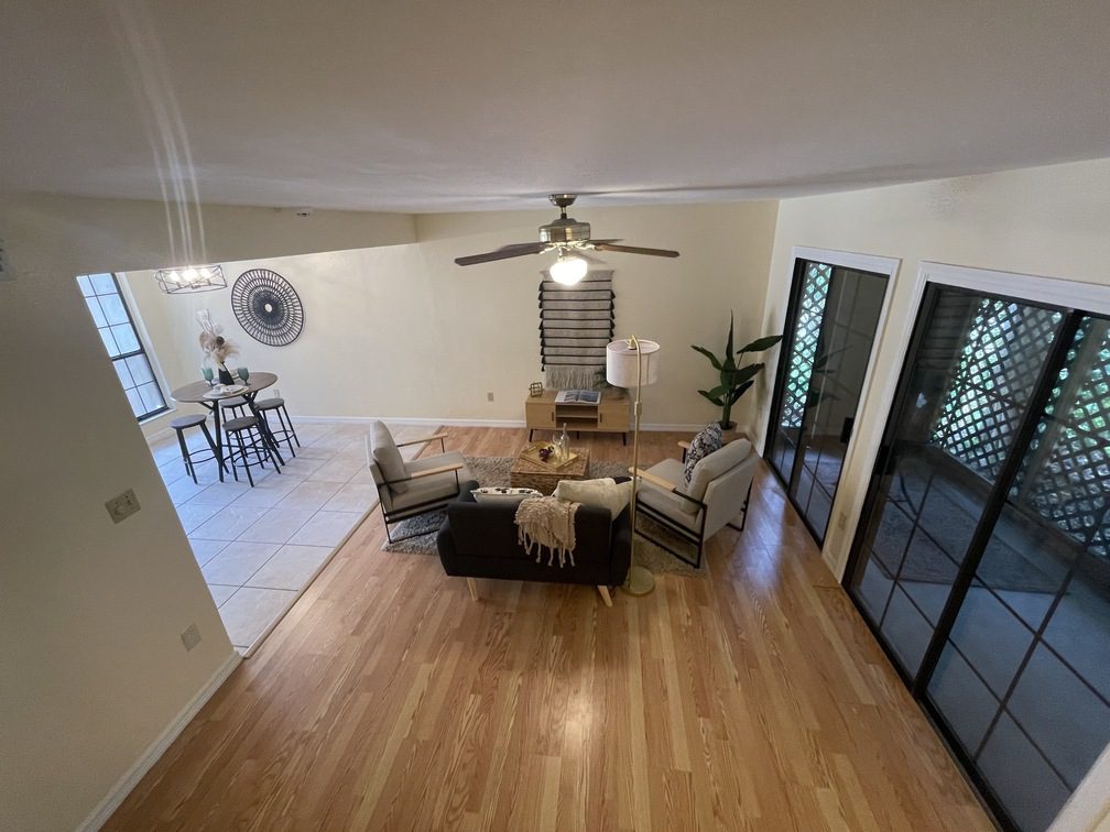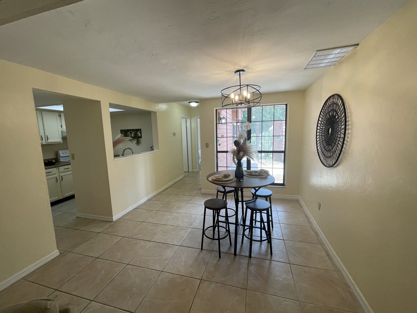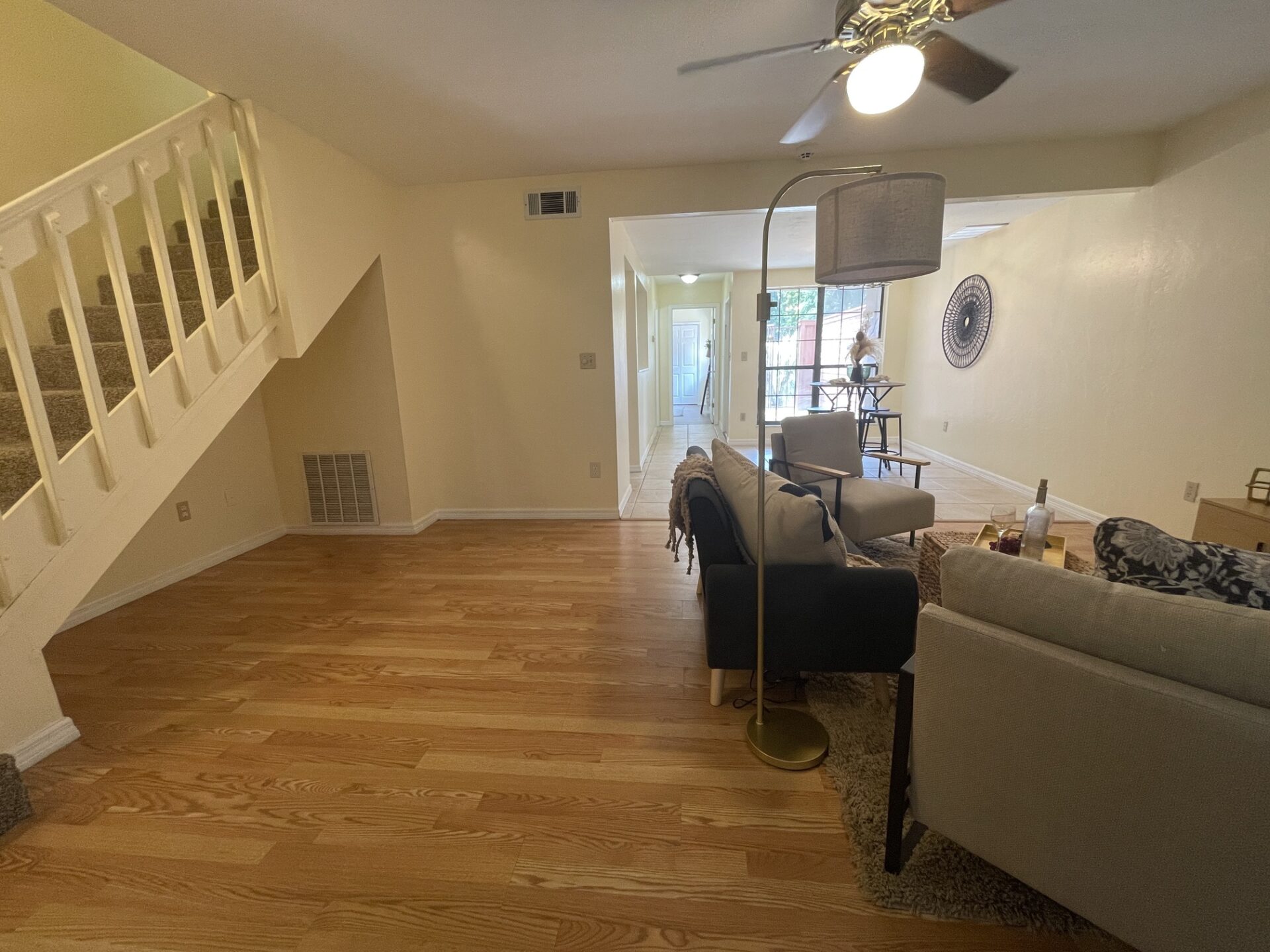 As you approach, a private courtyard entry welcomes you, setting the tone for the inviting atmosphere that awaits. Step inside, and the entry foyer unfolds into a spacious living room/dining room combination. Townhome boasts brand new luxury vinyl plank flooring in the upstair bedroom and bathroom. The dining room showcases elegant tiled floors, while the living room features vaulted ceilings.