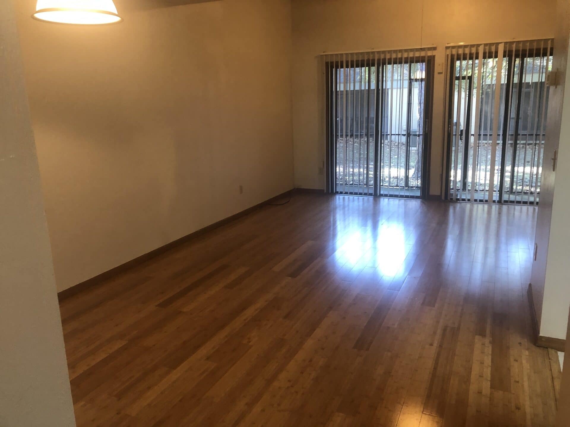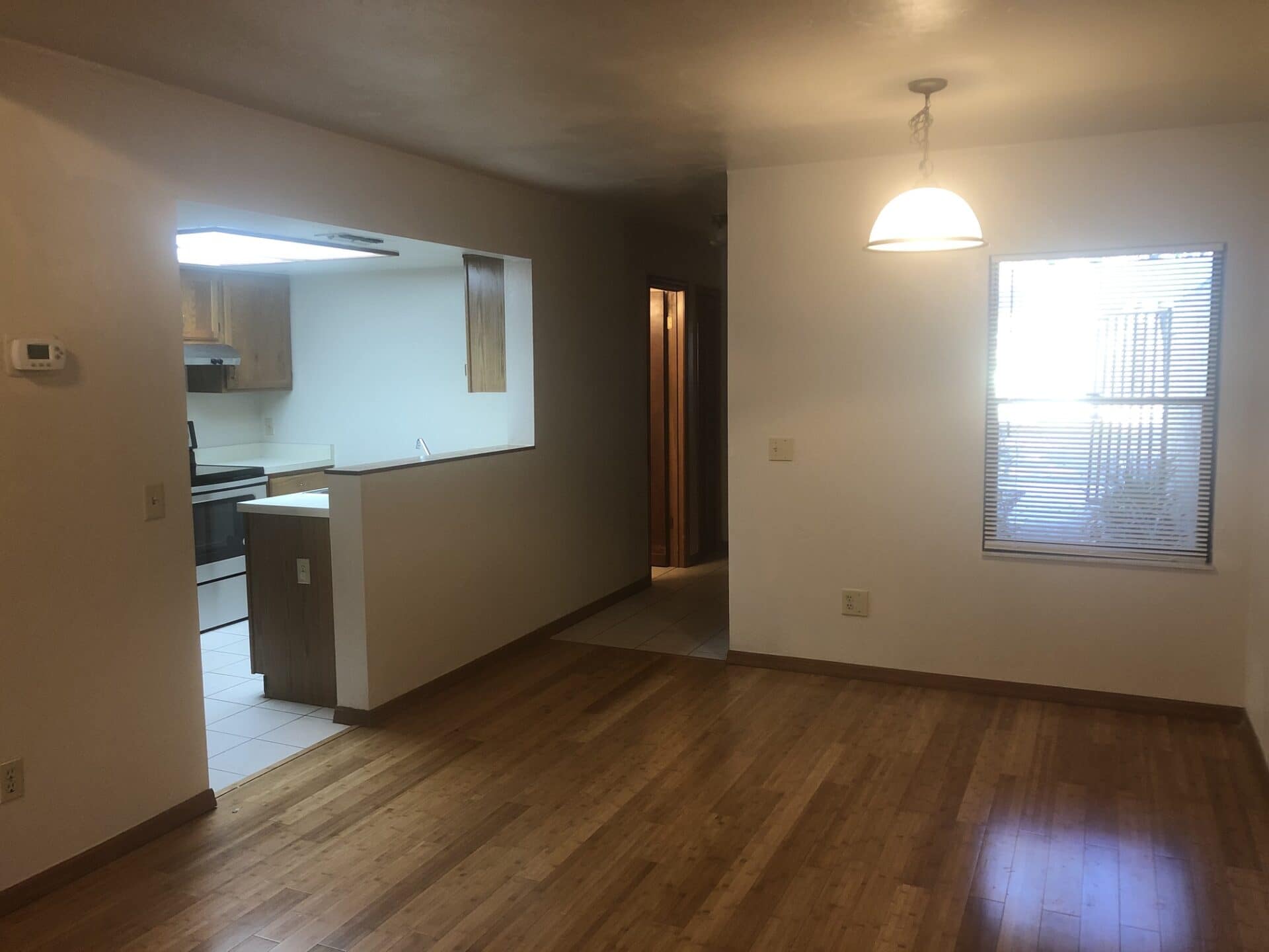 Step inside to an open and airy great room, featuring a living and dining room combination with laminate wood flooring, a recessed entertainment nook, and sliding glass doors leading to a screened back porch with an adjacent utility room equipped with washer and dryer connections.
