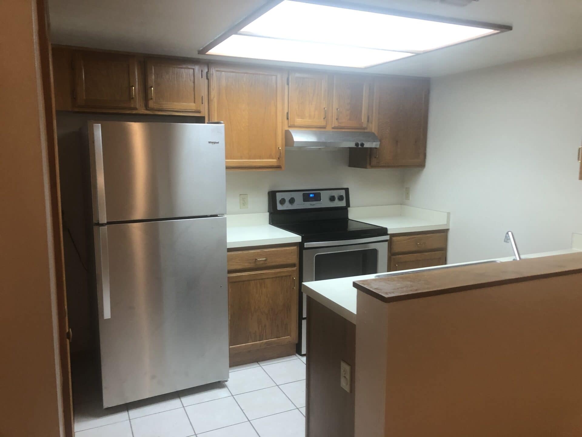 The kitchen shines with stainless steel appliances, offering both style and functionality.